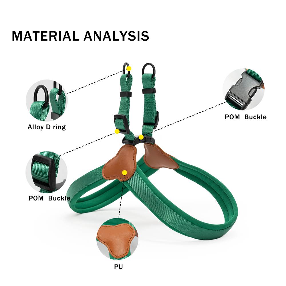 This pet chest and back adopts an ergonomic saddle-style design, fitting the curve of the pet’s back and dispersing pulling pressure to avoid compressing the chest and affecting breathing. The main body is made of high-quality diving material, featuring insulation, shock absorption, and high elasticity. It has a soft and skin-friendly touch, buffering impact during exercise. In winter and autumn, it can also keep the pet’s core area warm. The edges are reinforced with embedded nylon-like strong fabric strips, resistant to stretching and abrasion, and not prone to breaking. It is equipped with a high-quality POM quality snap fastener, opening and closing smoothly without jamming, resistant to low temperatures and impact. It is complemented by a zinc alloy buckle, resistant to rust and corrosion, with strong load-bearing capacity. The double-locking structure effectively prevents the pet from escaping. The product comes in three distinctive color schemes: green, brown, and patterned. Green is fresh and clean, brown is stable and serious, and the patterned one is playful. It is suitable for pets of different styles, balancing practicality and appearance, making pet walking more reassuring and aesthetically pleasing.